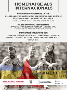 Per a aquest divendres 4 de novembre (19.30h, Espai Cultural Cases del Batle) hi ha prevista la conferència “Funcionament del correu de les Brigades Internacionals” a càrrec de Julian Palmero. Hi ha també una exposició sobre el correu postal en la Guerra Civil des del 28 d’octubre al 4 de novembre.