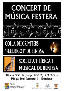 El pròxim dijous 29 de juny a les 20.30h la banda de la Societat Lírica i Musical de Benissa oferirà a la Plaça del Rei Jaume I i juntament amb la Colla de Xirimiters Pere Bigot de Benissa un concert de música festera, amb el qual s’iniciarà realment la Festa de Moros i Cristians a la nostra localitat.