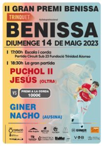 La competició començarà a les 17h amb una partida de la modalitat Escala i Corda del circuit sub 23 de la Fundació Trinidad Alfondo, i serà a partir de les 18.30h quan tinga lloc la gran partida que enfrontarà Pucho II, Jesús i Oltra contra Giner, Nacho i Oltra. El gran al·licient d’aquesta partida no és només el cartell, sinó el premi de 1.000 euros per al guanyador, un estímul atractiu que convertirà aquest gran premi en un esdeveniment emocionant.