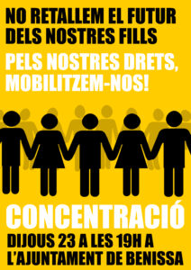La Plataforma pels Drets Socials de Benissa ha convocat per a hui dijous 23 de febrer a les 19h una concentració sota el lema “No retallem el futur dels nostres fills. Pels nostres drets, mobilitzem-nos!” a l’Ajuntament (Plaça del Portal). La Plataforma, que agrupa tant associacions com gent a títol personal, s’ha creat per defensar els serveis públics front als retalls que estan patint per part de les diferents administracions públiques.
