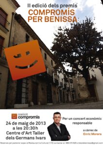 En l’acte de lliurament que es farà al Centre d’Art Taller dels Germans Ivars el pròxim divendres 24 de maig a les 20.30h, es comptarà amb la presència del secretari general del Bloc i portaveu de la Coalició COMPROMÍS a les Corts Valencianes, Enric Morera, que a banda de lliurara un dels premis ens presentarà el document “Per un concert econòmic responsable”.