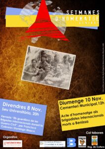 El diumenge 10 de Novembre a partir de les 12.00h al Cementeri hi haurà l’acte d’homenatge als brigadistes internacionals morts a Benissa, on hi haurà una ofrena floral a la tomba dels brigadistes i la interpretació d’algunes peces a càrrec de la Colla de Xirimiters Pere Bigot. L’acte compta amb la col·laboració de la Regidoria de Cultura de l’Ajuntament de Benissa i la Colla de Xirimiters Pere Bigot.