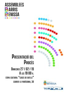 Un nou procés participatiu per tal de millorar la qualitat de vida de les persones que viuen a Benissa, a partir dels seus propis suggeriments i en perspectiva de barris. El pròxim 27 de febrer tindrà lloc la presentació pública del nou procés d’Assemblees per Barris de Benissa. Serà a l’Espai cultural Cases del Batlle -carrer la Puríssima 38-, a les 19.00h. Aquest projecte comença amb la creació d’espais de participació a tots els barris de Benissa per a l’elaboració de propostes i diagnòstics per a la millora del poble.