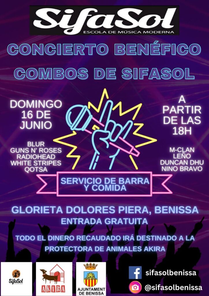 Amb motiu del 20é Aniversari de Sifasol, diumenge que ve 16 de juny a la Glorieta Dolors Piera de Benissa i a partir de les 18.00 fins a les 21.30, l’Escola de Música Moderna Sifasol Benissa farà un concert benèfic amb entrada gratuïta per a tot el públic que desitge assistir. En el concert actuaran més de 40 músics entre alumnes i professors de Sifasol. Els Combos joves i diferents combos d’adults interpretaran una llarga llista de temes de pop, rock, blues, funky, indie…. en espanyol i anglés, dirigits per Pep Ferrer; president i fundador de l’escola en 2004. La protectora Akira de Benissa serà la que s’encarregue del servei de barra amb begudes, menjar i dolços durant tot l’esdeveniment i en finalitzar l’actuació musical, hi haurà un sopar amb els professors, alumnes, familiars i en definitiva tots els que vulguen acompanyar-los. Hi haurà cadires i taules per cortesia de l’Ajuntament de Benissa per a tots els assistents. Tots els diners recaptats en l’esdeveniment aniran destinat a Akira que exerceixen una gran tasca per a ajudar als gossos.