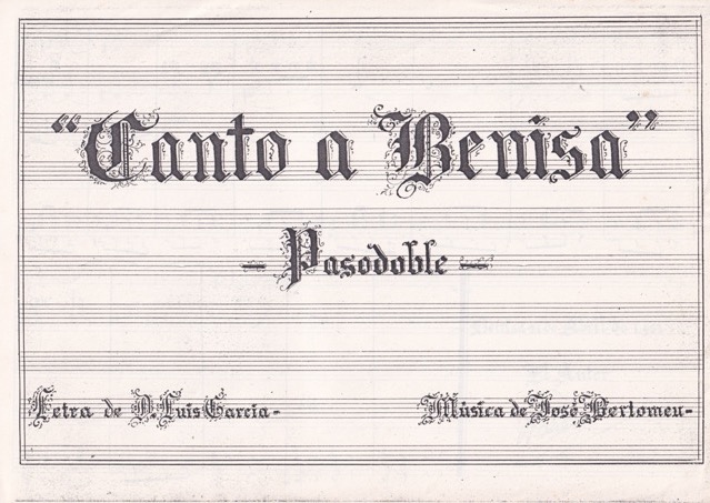 La composició del “Canto a Benissa” segurament anà perfeccionant-se a mesura que Bertomeu aconseguia coneixements de composició i en tal forma i rapidesa que en el mes d’abril de l’any 1951 consta que l’oferí a l’ajuntament amb la dedicatòria de “Al pueblo de Benisa, en su máxima autoridad dedico este trabajo”. La partitura, completament instrumentada, té la tapa retolada amb una bella cal·ligrafia gòtica, diu que és un pasdoble i les notes i lletra estan confeccionades amb moltíssima delicadesa i feta de mà d’un bon copista i que curiosament és coincident amb el traçat fi de la firma de Bertomeu al final del pentagrama. No sé a qui li encarregaria Bertomeu eixa feina de còpia, pel demés normal i habitual, i que és molt professional per quan jo he vist altres composicions i correccions fetes per Bertomeu i és una lletra diferent ignorant si pel temps el mestre variaria la seva cal·ligrafia.