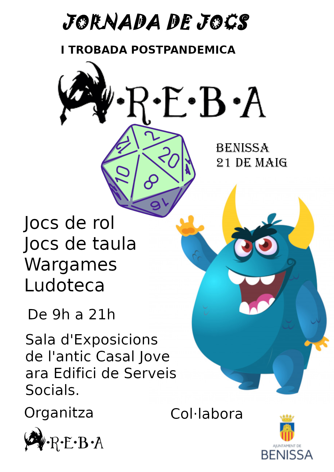 Així que organitzem una jornada de jocs el pròxim 21 de maig, en horari de 9h a 21h a la sala d’exposicions de l’antic casal jove. Aquest esdeveniment, dirigit a tots els públics, té l’objectiu de donar a conéixer l’associació AREBA, la finalitat de la qual no és una altra que la promoció de l’oci alternatiu. En aquesta jornada el públic assistent podrà gaudir de l’oportunitat de provar diversos tipus de jocs: nous, clàssics, de simulació històrica, de ciència-ficció o fantasia.