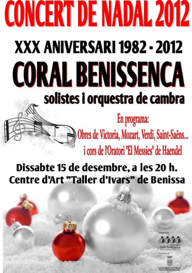 El pròxim dissabte 15 de desembre, a les 20.00, al Centre d’Art “Taller d’Ivars” de Benissa, tindrà lloc el tradicional Concert de Nadal de la Coral Benissenca, amb el qual finalitza la commemoració del XXX aniversari d’aquesta associació.