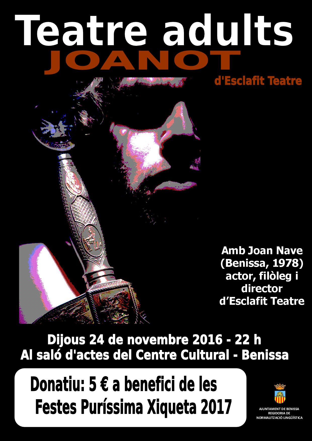 Joan Nave (Benissa, 1978) presenta a Benissa, el seu poble, l’obra de teatre, JOANOT, sobre el cavaller i escriptor valencià Joanot Martorell, situada a l’hivern de 1464. Nave, actor i filòleg, està al capdavant de la companyia Esclafit Teatre, i ha dedicat “un any d’immersió en la documentació exhumada sobre la vida dels Martorell que ara pren forma escènica”.