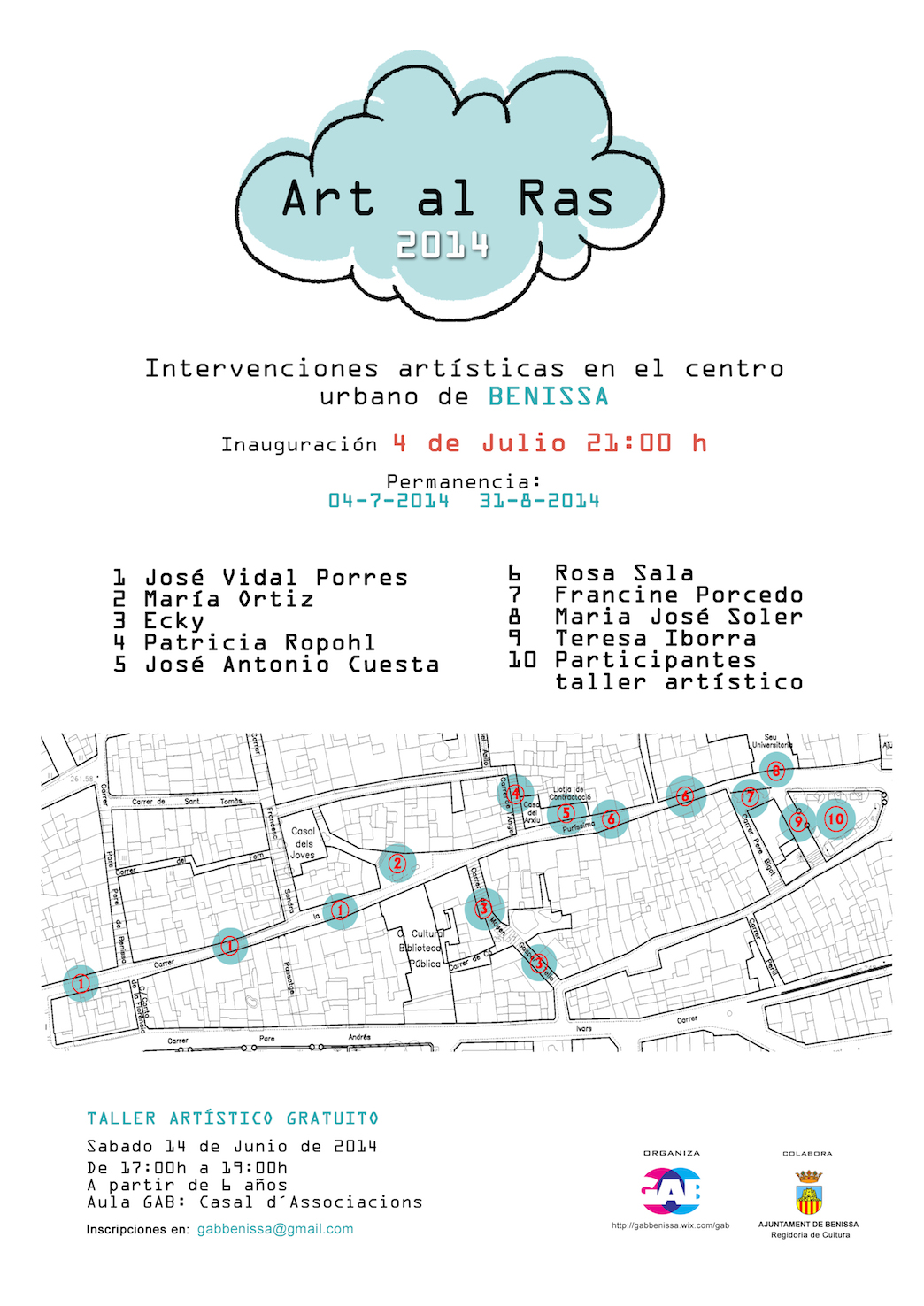 Nou intervencions urbanes corresponents a altres tants artistes integrants d’aquesta associació s’exposaran al carrer Puríssima i a la plaça de l’Esglèsia Vella, situant-se també en aquesta plaça els dos treballs creatius del taller artístic fet el passat 14 de juny: Mar, David , Sara, Marianna, Anais, Pepe, Pau, Anna, Marta Vicente, Marta Castillo i Lucía.