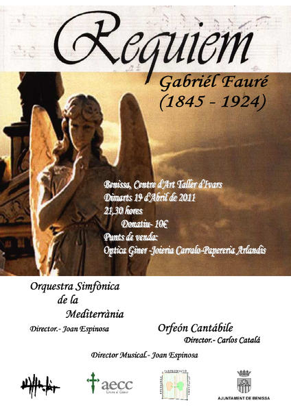 En aquest concert, amb Joan Espinosa a la batuta, l’Orquestra, acompanyada de l’Orfeó Cantabile dirigit per Carlos Català, interpretarà les obres Pavana per a una infanta difunta, de Ravel, i una Elegia per a Cello i Orquestra i una Pavana en Fa sostingut de Fauré, mentre que la segona part queda dedicada al Requiem del compositor francés Gabriél Fauré.