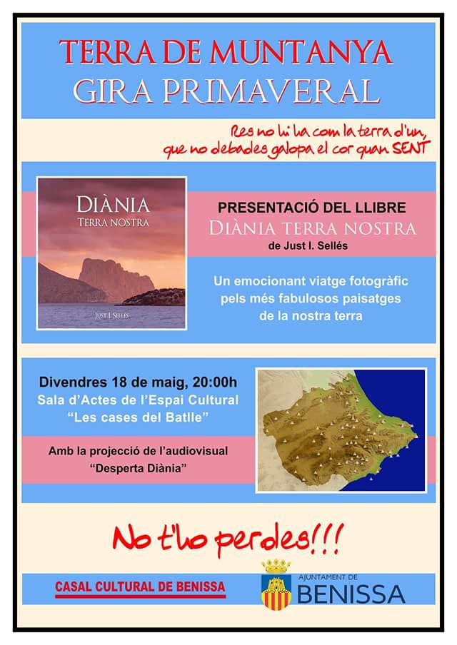 El Casal Cultural de Benissa ha organitzat esta vesprada (20.00h, Cases del Batle) la presentació del llibre “Diània, terra nostra”, obra que recull un viatge fotogràfic de gran qualitat per alguns dels paisatges de la nostra terra. L’acte comptarà amb la presentació del seu autor, Just. I Sellés, i a més es projectarà el documental “Desperta Diània”.