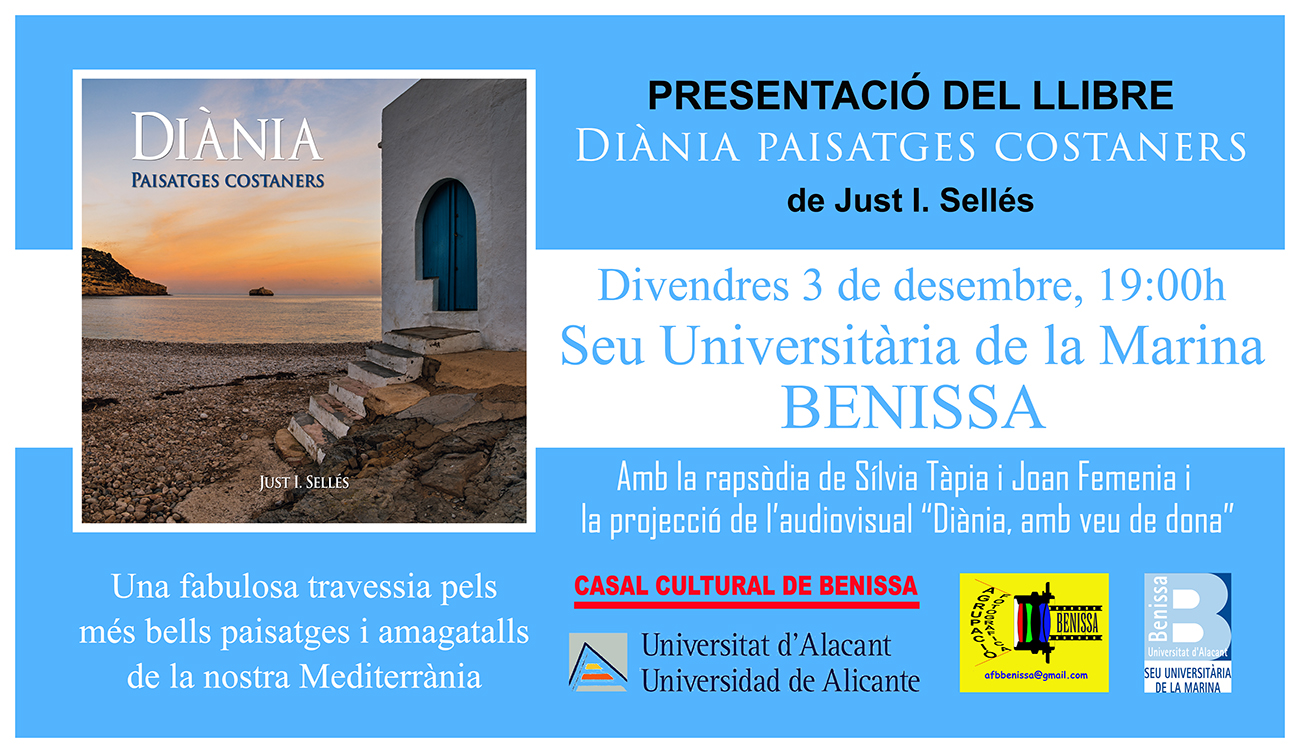 L’escriptor Just Sellés presenta demà divendres 3 de desembre a les 19.00h a la Seu Universitària de la Marina el seu llibre “Diània, paisatges costaners”, una travessia fotogràfica amb 350 instantànies dels fabulosos paisatges de la Mediterrània. L’acte inclou la rapsòdia de Silvia Tàpia i Joan Femenia i la projecció de l’audiovisual “Diània amb veu de dona”.