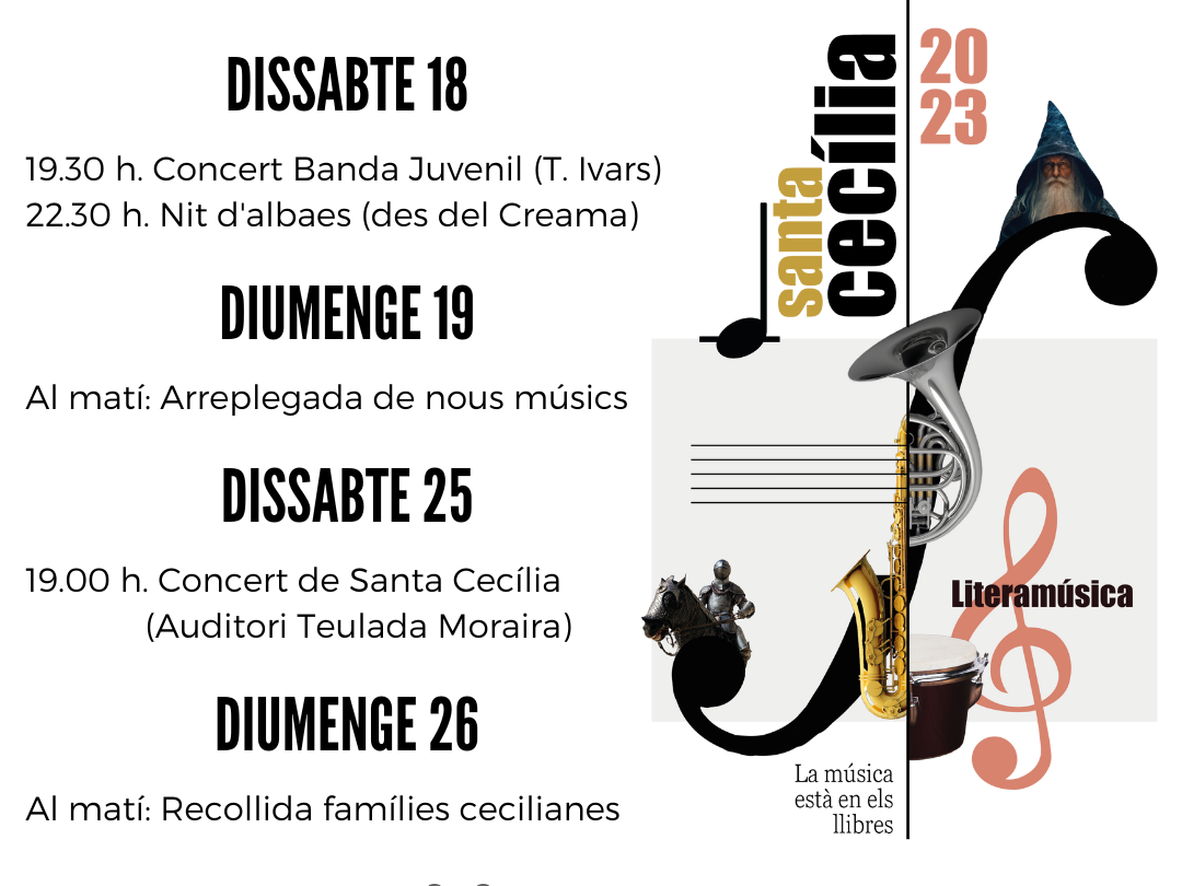 Per tal d’inaugurar el segon cap de setmana de Santa Cecília, la Banda de Benissa presentarà Literamúsica, un concert que està ple de reptes i de molta il·lusió per superar-los amb el qual s’aconsegueix crear una fusió de la literatura i, com no, la música. Tal com s’ha esmentat anteriorment, l’associació es traslladarà a l’Auditori Teulada-Moraira per tal de portar a terme aquesta actuació, que tindrà lloc el dissabte 25 de novembre. Únicament els i les assistents que disposen d’una entrada podran accedir al recinte; aquelles persones que siguen sòcies de la Societat Lírica i Musical de Benissa podran tenir entrada de manera totalment gratuïta els dies 14 i 15 de novembre de 17 h a 20 h al C. Sant Sebastià, núm. 32 (antiga llibreria Arlandis). D’altra banda, la resta d’assistents podrà aconseguir la seua entrada per tan sols 5 € el dia 16 de novembre en la ubicació esmentada de 17 h a 20 h. En cas que qualsevol espectador es trobe amb cap problema, podrà posar-se en contacte amb info@bandadebenissa.org o telefonant al 618 940 068. Una vegada passat el concert, el diumenge 26 de novembre la Banda circularà per Benissa per a recollir les famílies cecilianes d’enguany.