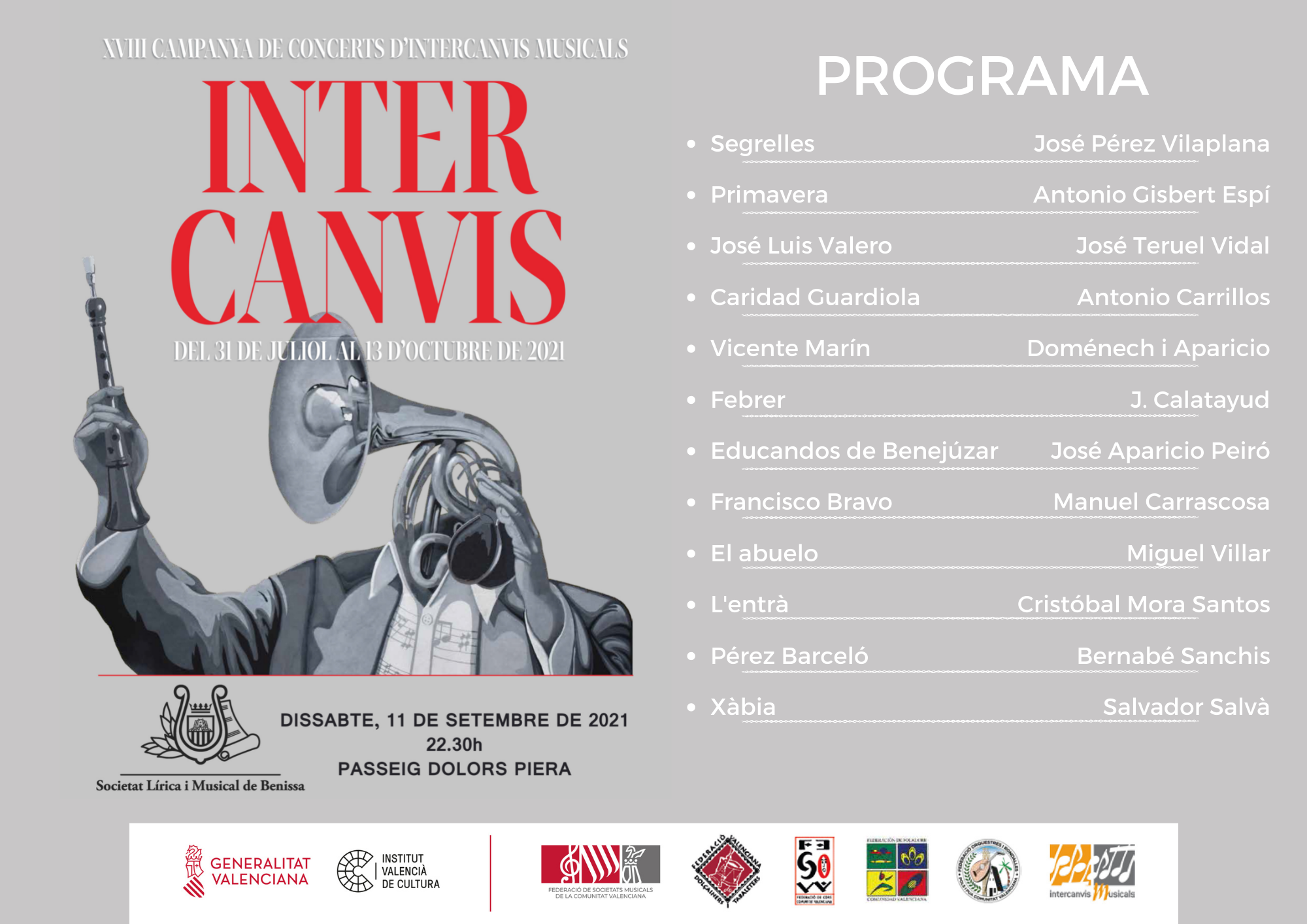 Des de la Societat Lírica i Musical de Benissa es vol convidar a l’acte de la XVIII campanya d’intercanvis musicals el pròxim dissabte 11 de setembre a les 22.30h al Passeig Dolors Piera de Benissa.