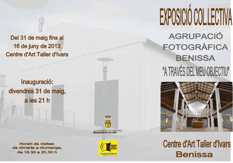 L’Agrupació Fotogàafica de Benissa, en col·laboració amb la Regidoria de Cultura de l’Ajuntament de Benissa, inaugurarà l’exposició col·lectiva “A través del meu objectiu”, Serà aquest divendres 31 de maig a les 21.00 al Centre d’Art Taller d’Ivars. L’exposició es podrà visitar de dimarts a diumenge en horari de 18.30 a 20.30.