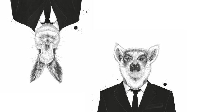Animalades i civilització convivint en un mateix espai. El vestit per damunt de l’animal, el cap sobreix de la jaqueta. Jaqueta botonada, corbata lligada al coll, elegantment posant per al retrat. Senzillesa d’un sol element format per dues peces, dues tècniques quasi oposades d’una mateixa disciplina, d’una tonalitat semblant.