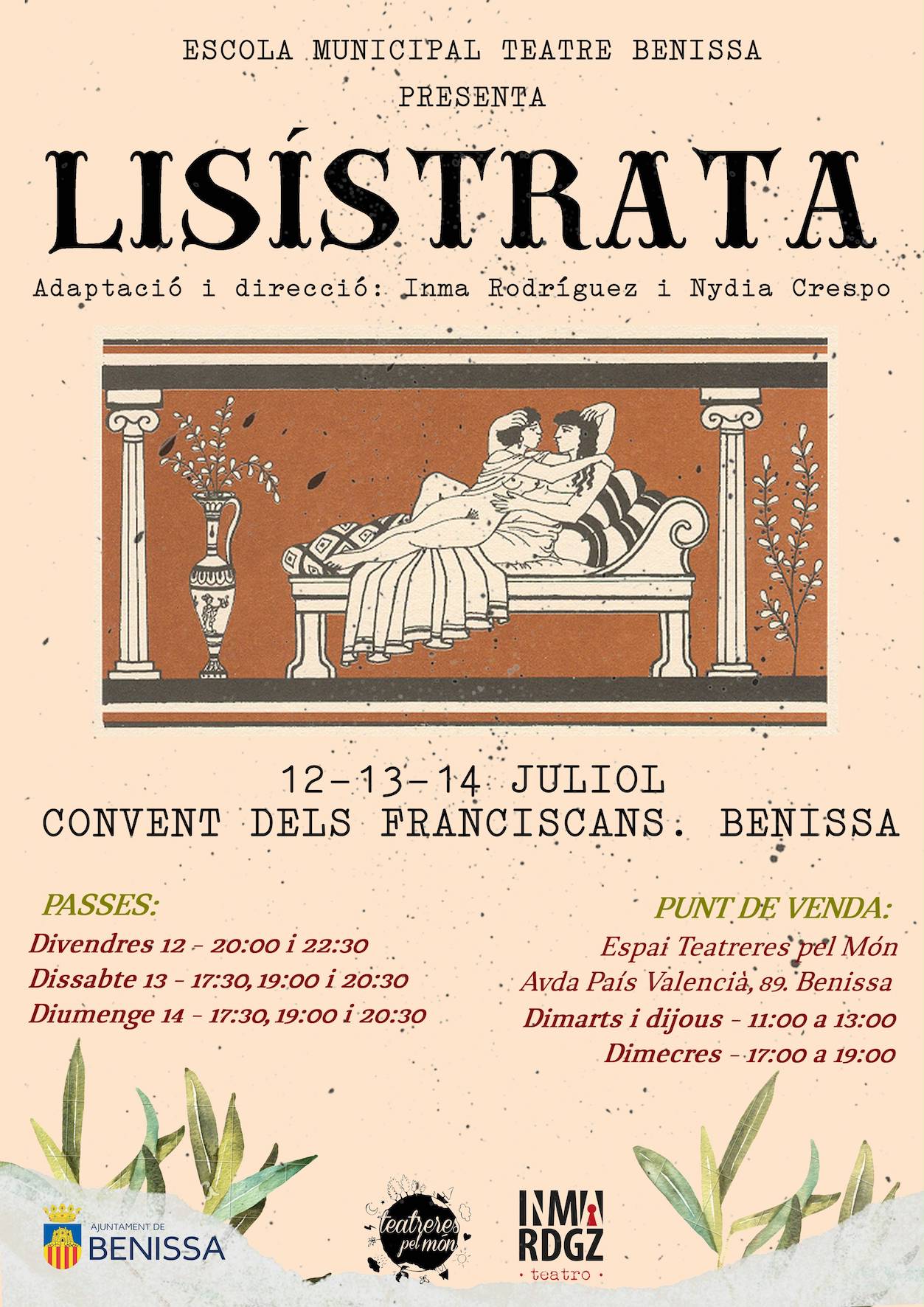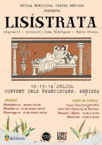 L’Escola de Treatre de Benissa presentarà l’obra “Lisístrata” al Convent dels Franciscans els pròxims dies divendres 12 de juliol (20.00h i 22.30h), dissabte 13 de juliol (17.30h, 19.00h i 20.30h) i diumenge 14 de juliol (17.30h, 19.00h i 20.30h).
