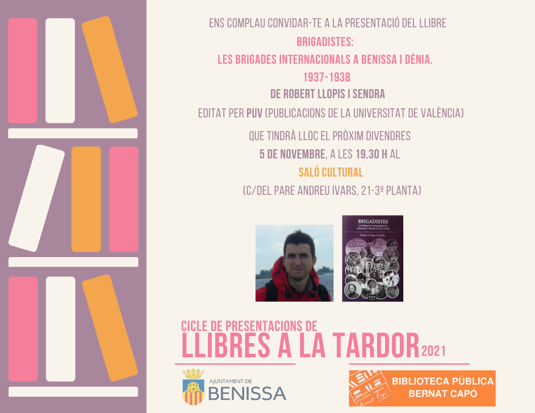 Les Setmanes d’Homenatge tornen un any més a Benissa. Per a aquest divendres 5 de novembre (19.30h, Saló d’Actes del Centre Cultural) està prevista la presentació del llibre “Brigadistes: Les Brigades Internacionals a Benissa i Dénia. 1937-1938”, publicat per Publicacions de la Universitat de València. El llibre, que obri el cicle de presentacions literàries de “Lllibres a la tardor”, serà presentat pel seu autor, l’investigador benisser Robert Llopis i Sendra i és un recull d’anys d’una completa investigació sobre la presència de les brigades internacionals a Benissa i Dénia durant la Guerra Civil Espanyola.