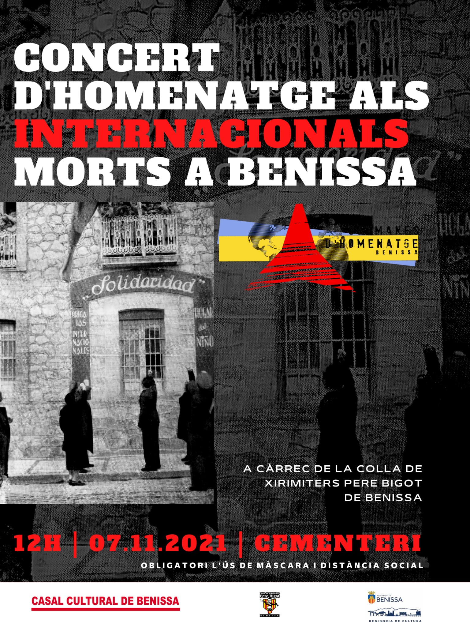 Per altra banda, el diumenge 7 de novembre a les 12.00h es farà al Cementeri municipal el Concert d’Homenatge als Internacionals morts a Benissa, a càrrec de la Colla de Xirimiters Pere Bigot de Benissa. Hi haurà uns parlaments en rècord dels brigadistes i l’ofena floral.