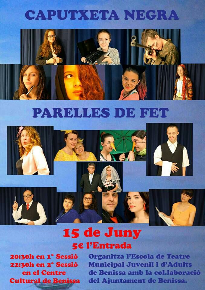 Aquest cap de setmana es podrà comprovar el treball que han realitzat durant tot el curs els alumnes de l’Escola municipal de Teatre i de l’Escola de Teatre Juvenil. Aquest dissabte 15 de juny es representaran les obres “Caputxeta Negra” i “Parelles de Fet”, a les 20.30 en primera sessió i a les 22.30 en segona sessió, a la sala d’actes del Centre Cultural. Les entrades es podran adquirir per un mòdic preu de 5 euros.