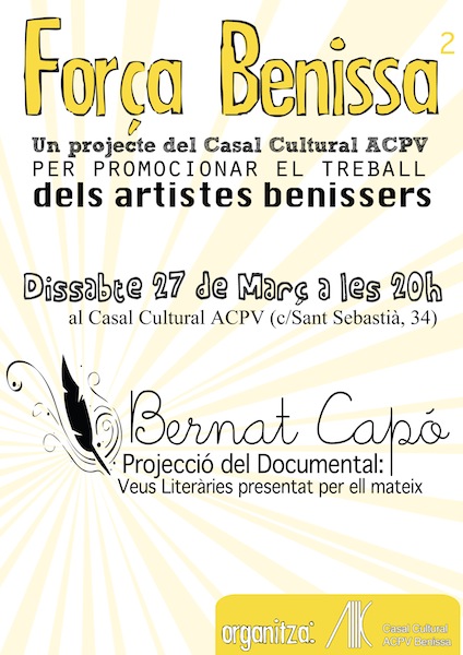 L’acte consistirà en la projecció del documental “Veus Literàries: Bernat Capó”, un documental inèdit que ens ajuda a apropar-nos a aquest escriptor benisser, i que, a més, tindrà l’al·licient de comptar durant la seua presentació amb la participació de Bernat Capó.