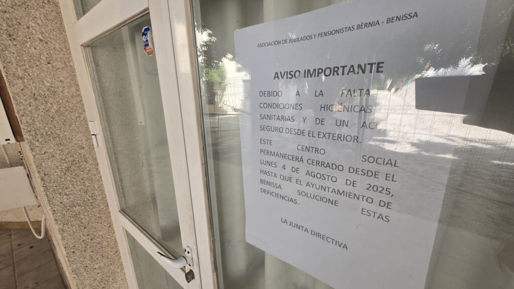 L’Associació de Jubilats de Benissa ha plantat el cartell de tancat a l’entrada del seu centre social. Però no és un ‘tancat per vacances’, sinó per malestar per la falta de resposta de l’ajuntament per a esmenar deficiències “sanitàries, higièniques i de seguretat”, lamenten en un comunicat compartit a tots els seus associats per WhatsApp.