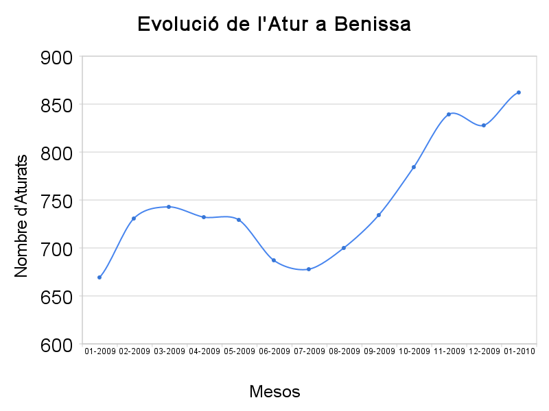 La taxa d’atur a Benissa ha assolit el 10, 58% de la seua població activa en aquest primer mes de l’any, segons les dades publicades recentment pel Servef. Aquesta tendència es manté constant des del mes de juliol passat, després de la lleugera recuperació que es va experimentar als mesos de maig i juny de 2009.