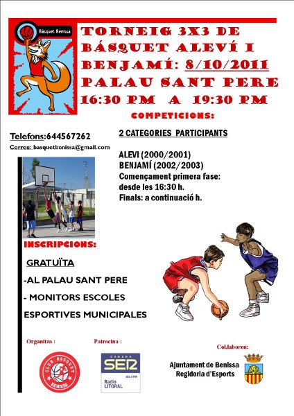 Hui dissabte, de 16.30 a 19.30, es disputarà al Palau Sant Pere de Benissa el Torneig 3×3 de Bàsquet aleví i benjamí. El torneig està dividit en dues categories: Aleví (xiquets nascuts el 2000 i 2001) i Benjamí (xiquets nascuts els anys 2002 i 2003).