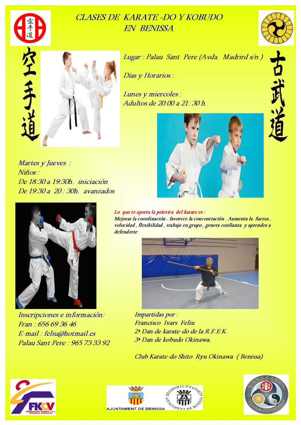 El Club de Karate-do Shito Ryu Okinawa comença la temporada de classes de karate i kobudo a Benissa dirigides tant a xiquets com a adults. Les classes per a xiquets començaran el 2 d’octubre i es faran els dimarts i dijous de 18.30h a 19.30h (nivell iniciació) i de 19.30h a 20.30h (nivell avançat). Per la seua banda, els adults tindran classe els dilluns i dimecres de 20.00h a 21.30h.