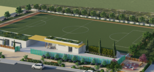 En la instal·lació ha prevalgut la sostenibilitat, així com una cuidada integració amb l’espai que produïsca el mínim impacte ambiental, alhora que enriquisca l’entorn amb una important aportació de zona verda i àrea d’esbarjo. A més, comptarà amb una edificació annexa amb vestuaris, condícies, quart d’instal·lacions i magatzem (260 m²) composta per dos volums rectangulars d’una sola planta i units per un porxo. Adossats als edificis, per la seua part posterior, es troben les graderies prefabricades de formigó armat vist, formades per tres files de seients a nivell d’accés per a millorar les vistes sobre el camp i la seua accessibilitat. La pista tindrà unes dimensions de 60×35 metres coberta per gespa artificial d’última generació amb monofilaments i estructura semicòncava amb efecte memòria, a més d’una banda perimetral de seguretat d’1.5 metres d’ample, perfectes per a la pràctica esportiva. En els tres costats que no ocupen les graderies, a una distància de 3 metres des de l’exterior de la banda de seguretat es col·locarà una tanca de tela metàl·lica d’una altura de 2.5 metres. A més, sobre els edificis s’instal·laran plaques fotovoltaiques que serviran per a calfar l’aigua.