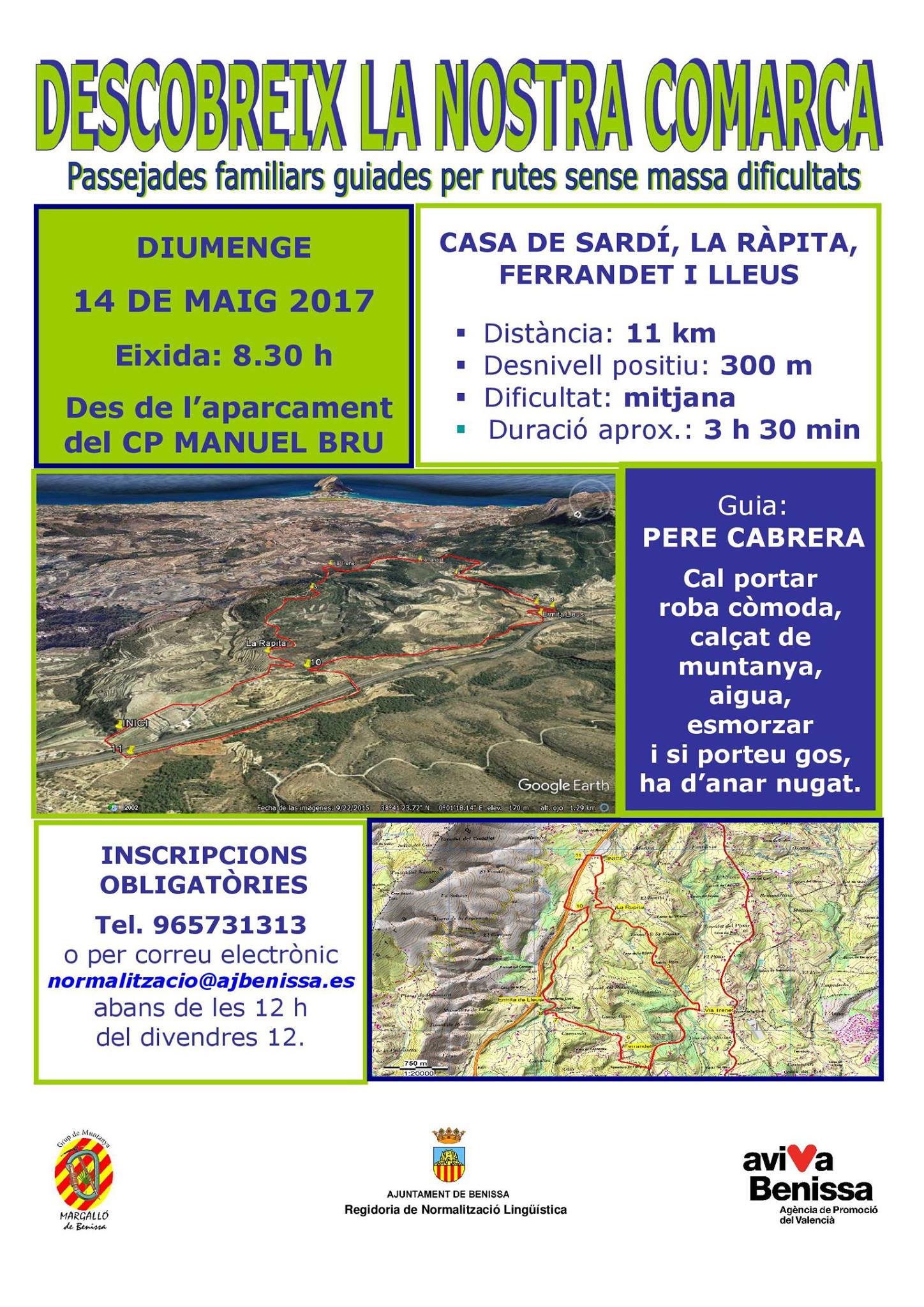 Aquest diumenge 14 de maig es realitzarà l’última de les passejades del cicle Descobreix la nostra comarca 2016-2017, organitzat per la regidoria de Normalització Lingüística de l’Ajuntament de Benissa, en col·laboració amb el Grup de Muntanya Margalló i que consistirà en una ruta per la partides de La Ràpita, Ferrandet i Lleus, passant per la casa de Sardí.
