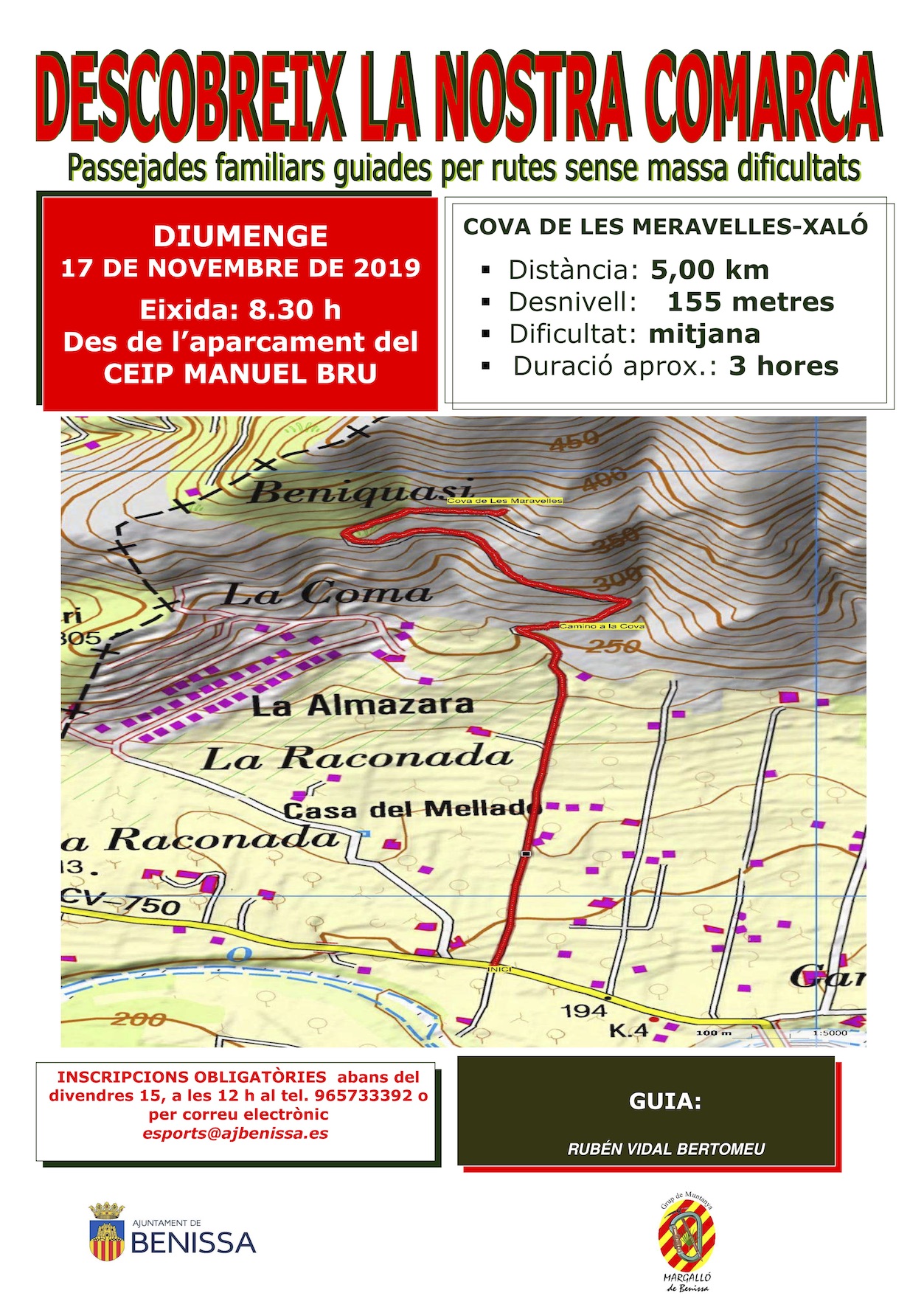 S’eixirà des de Benissa en cotxes particulars per a anar fins Xaló, on es farà la ruta, la qual eixirà des de la Tourist Info (Av. Juan Carlos I) fins la Cova de les Meravelles. L’eixida serà a les 8.30h del matí des de l’aparcament de l’Escola Manuel Bru. Per a la gent que isca directament des de Xaló, el segon punt d’encontre i eixida serrà a les 9.00h des de la mateixa Tourist Info.
