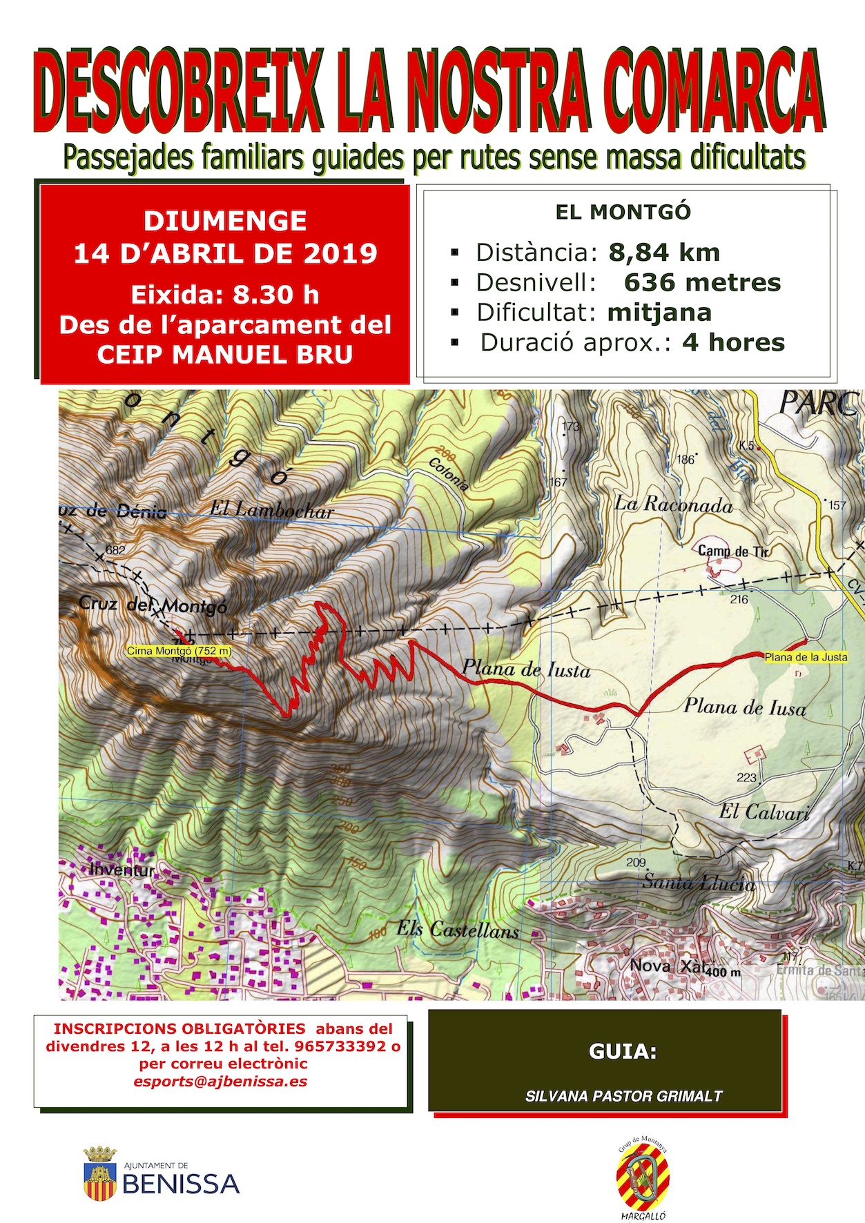 El diumenge 14 d’abril hi haurà una nova passejada dins del cicle DESCOBREIX LA NOSTRA COMARCA 2018-2019. S’eixirà des de Benissa en cotxes particulars per a anar fins al Montgó, en terme de Xàbia, on es farà una ruta que partirà de la zona de les Planes fins al cim del Montgó. L’eixida serà a les 8.30h del matí des de l’aparcament de l’Escola Manuel Bru.