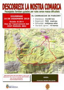 Aquest recorregut de dificultat mitjana-alta, no recomanat per a xiquets, estarà guiat per Francesc Grueso Ballester. La distància és de 14.5km, amb un desnivell de pujada de 765 metres, que es farà en unes 6 hores aproximadament.