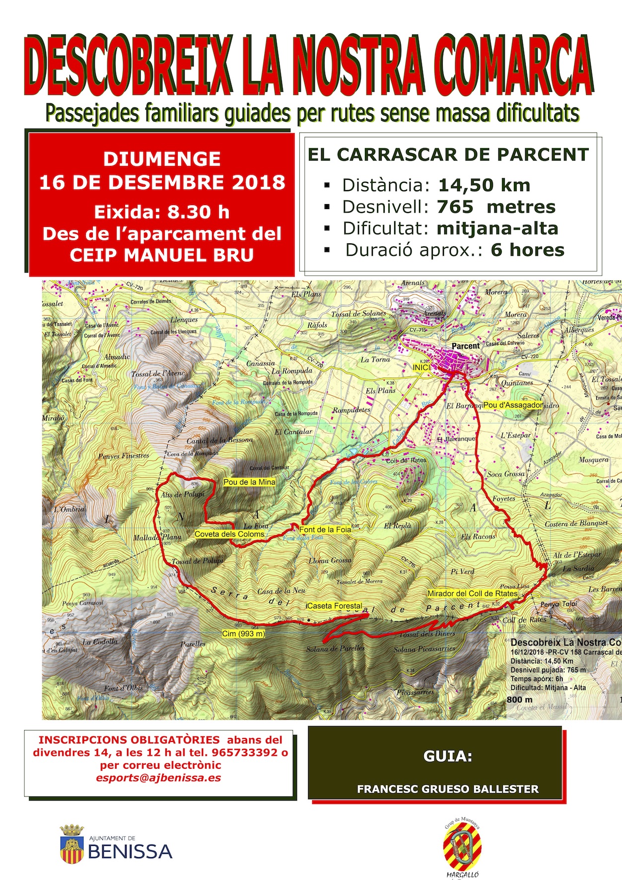 El diumenge 16 de desembre hi haurà una nova passejada dins del cicle “Descobreix la nostra comarca 2018-2019”, amb una ruta que eixirà des de Benissa fins Parcent, on es farà la ruta del Carrascar de Parcent. Durant el trajecte de la ruta es visitaran diversos punts d’interés d’aquest terme municipal.