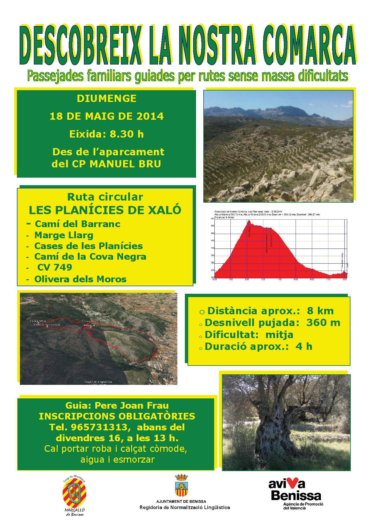 El cicle “Descobreix la nostra comarca” finalitza la temporada 2013-2014 aquest diumenge 18 de maig amb una ruta circular per “Les planícies de Xaló”. A les 8.30h s’eixirà des de l’aparcament de l’Escola Pública Manuel Bru de Benissa. Aquest recorregut de dificultat mitjana, estarà guiat per Pere Joan Frau. S’iniciarà pel Camí del Barranc i pel Marge Llarg fins les Cases de les Planícies. Després es continuarà pel Camí de la Cova Negra, CV-749 fins l’Olivera dels Moros i la volta serà pel Camí del Barranc fins el punt d’eixida. La distància és de 8 quilòmetres, amb un desnivell de pujada de 360 metres i un temps estimat de 4 hores.