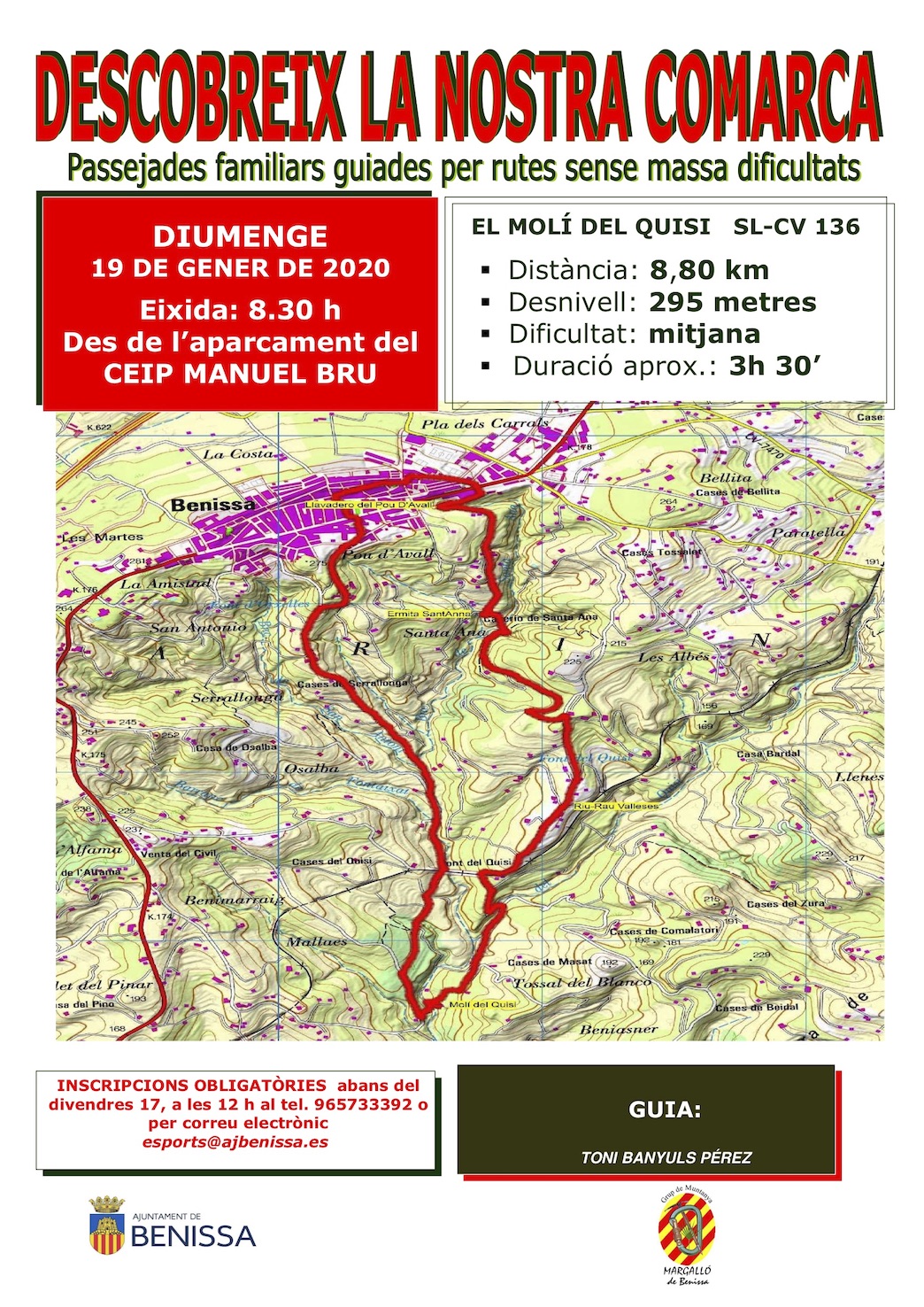 El diumenge 19 de gener hi haurà una nova passejada dins del cicle DESCOBREIX LA NOSTRA COMARCA 2019-2020. S’eixirà des de Benissa a peu per a anar per Santa Anna fins al Molí del Quisi, on es farà una ruta circular i tornada a Benissa. L’eixida serà a les 8.30h del matí des de l’aparcament de l’Escola Pública Manuel Bru.