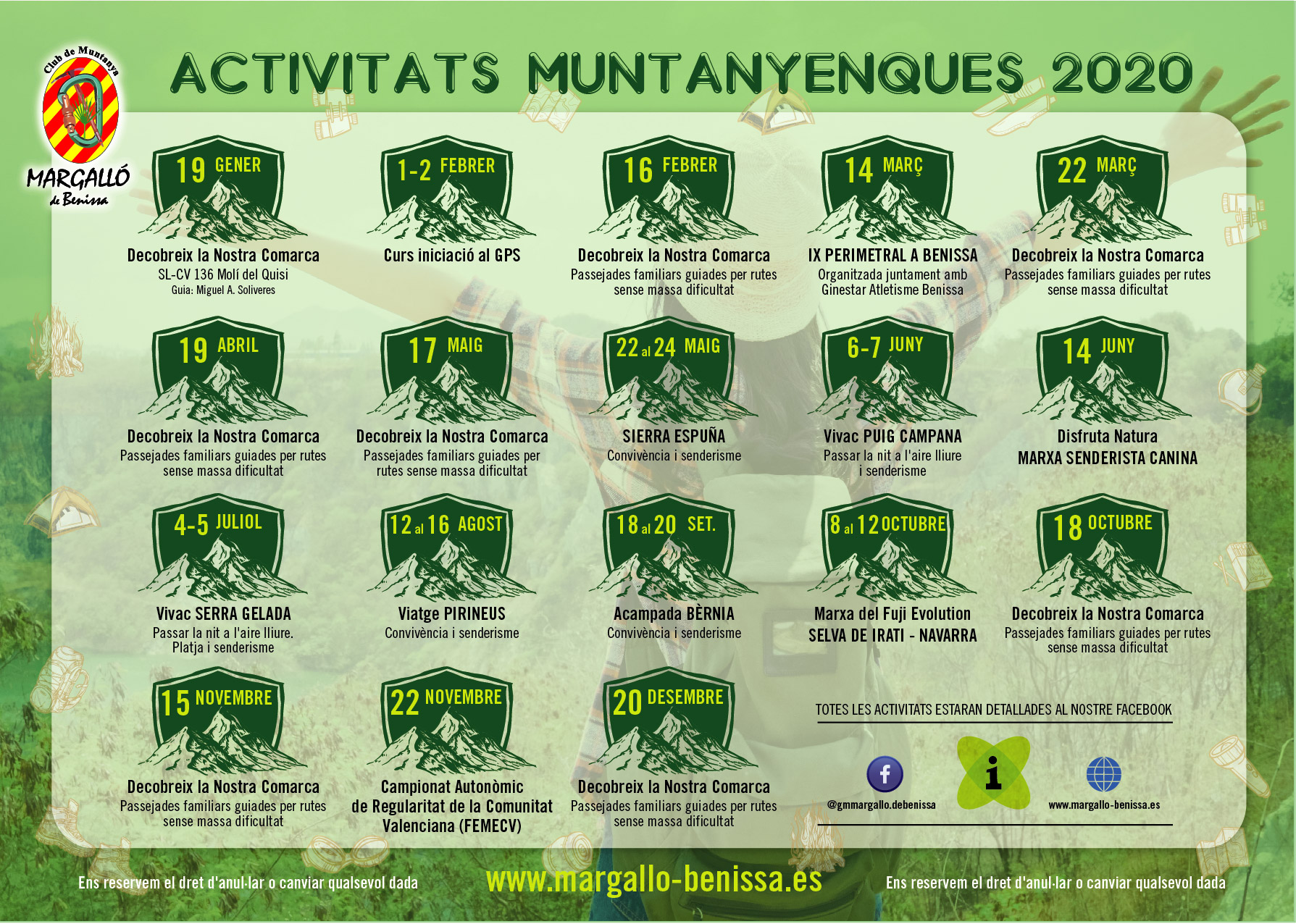 A més de les conegudes “DESCOBREIX LA NOSTRA COMARCA”, “MARXA DEL FUJI – EVOLUTION” i “LA PERIMETRAL A BENISSA”, ens donen a conéixer el “CAMPIONAT AUTONÒMIC DE REGULARITAT DE LA COMUNITAT VALENCIANA”, organitzat juntament amb la FEMECV, previst per al mes de novembre. Una altra important novetat és la MARXA CANINA, prevista per a juny, activitat pensada perquè les persones gaudisquen junt a les seues mascotes d’una jornada de senderisme i conscienciar en matèria de legalitat i higiene.