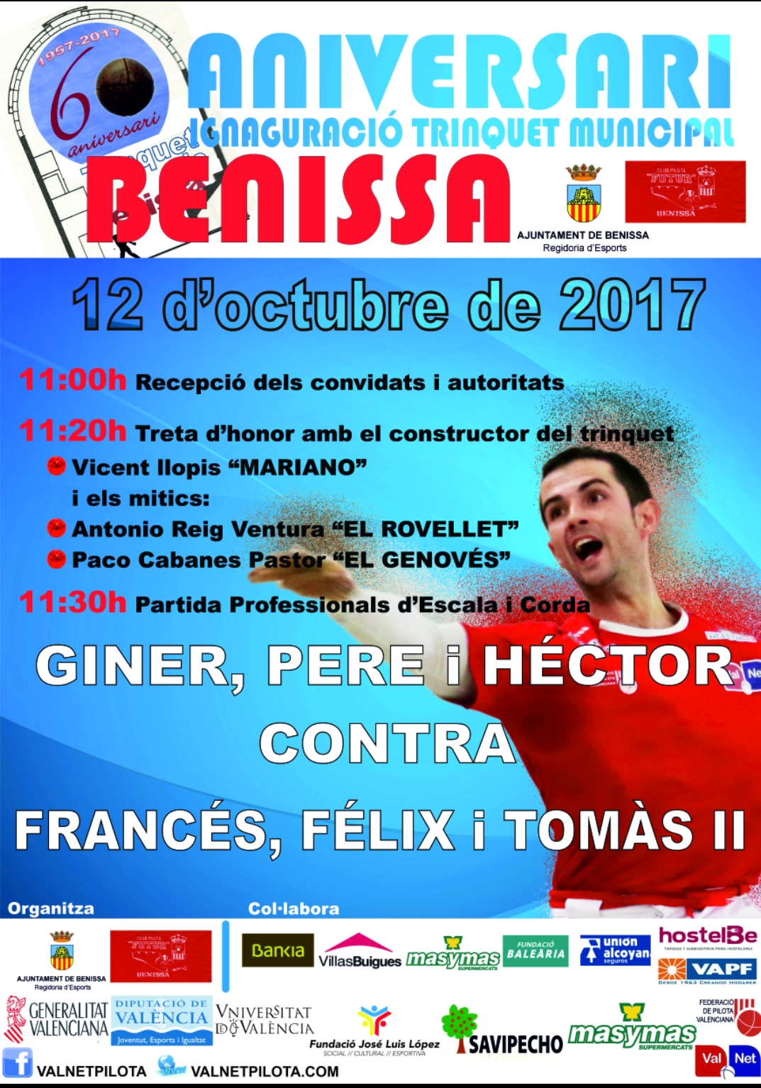 José Ramiro Capó, exjugador de Benissa, Pere Ribes, jugador professional i monitor de l’Escola municipal, i Xavi Tro, regidor d’Esports, van presentar ahir dimarts l’acte principal del 60é aniversari del trinquet local. Serà aquest dijous, 12 d’octubre, un moment en el qual sis jugadors de renom s’enfrontaran, sent 5 d’ells de la Marina Alta. Giner, el propi Pere Ribes i Héctor jugaran contra Francès, Félix i Tomàs II, amb el servei d’honor per part d’Antonio Reig, ‘El Rovellet’ i Paco Cabanes ‘El Genovés’, autèntiques llegendes vives de la pilota valenciana que estaran acompanyats per Vicent Llopis ‘Mariano’, el constructor que va erigir aquestes infraestructures, 60 anys enrere.