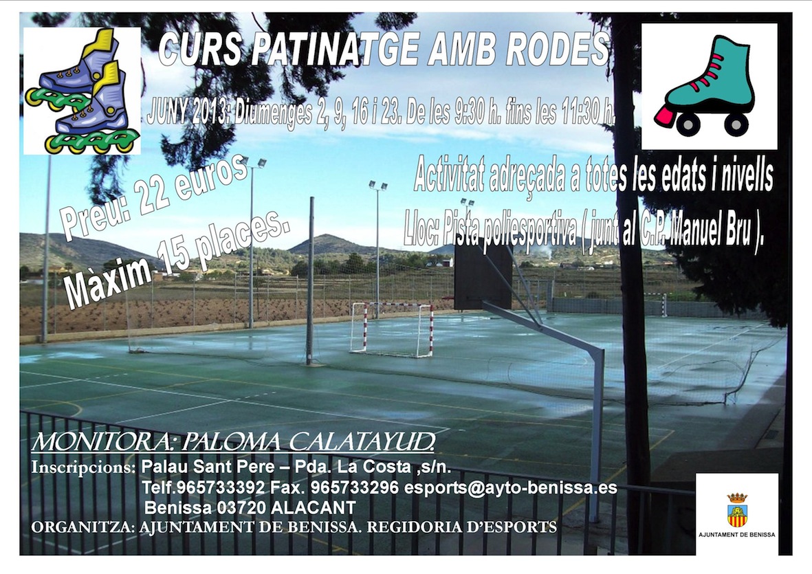 La Regidoria d’Esports ha organitzat un curs de patinatge sobre rodes. S’impartirà els diumenges del mes de juny, concretament els dies 2, 9, 16 i 23 de juny, de 9.30 a 11.30h.