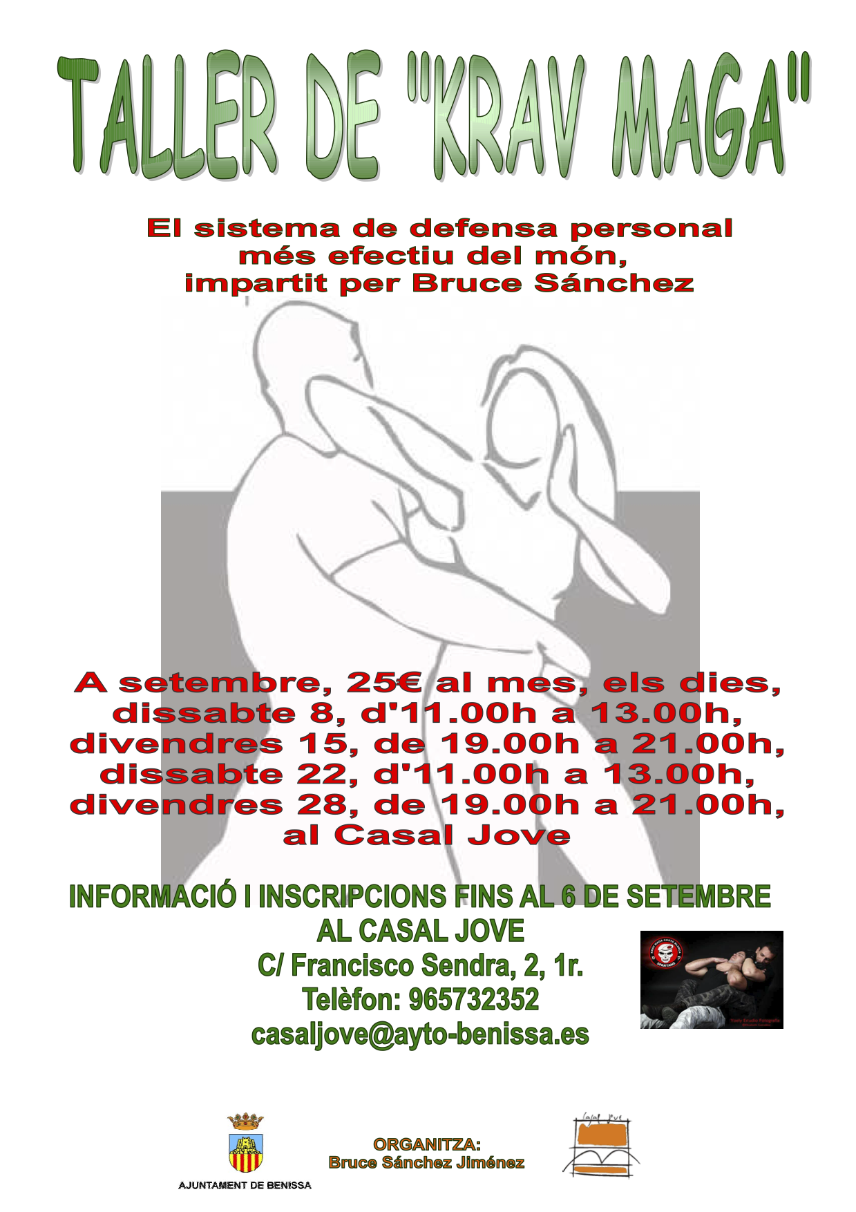 La Regidoria de Joventut de l’Ajuntament de Benissa amb la col·laboració de l’entrenador Bruce Sánchez Jiménez, ha organitzat el taller de Krav Maga, tècnica de defensa personal que es defineix com el millor sistema del món. El taller serà impartit a la sala polivalent del Casal Jove per Bruce Sánchez, cinturó negre 2n Dann, pel Consell Superior d’Esports i entrenador Nacional nivell II en Krav Maga pel Consell Superior d’Esports d’Espanya.