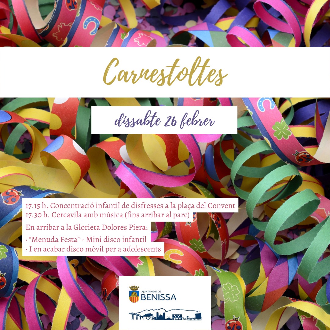 La regidoria de Joventut i la de Festes han organitzat conjuntament un programa d’activitats per a celebrar Carnestoltes a Benissa. El dissabte 26 de febrer, a les 17.15 h tindrà lloc la concentració infantil de disfresses a la plaça del Convent, seguida d’una cercavila que arribarà fins al parc Dolors Piera. Una vegada allí, s’ha previst la celebració d’una festa infantil a la qual li seguirà a partir de les 23h una discomòbil per al públic adolescent que serà amenitzada pel dj Javi Mengu. Des de l’ajuntament s’ha valorat de manera molt positiva aquesta merescuda activitat per als més joves de la casa després de dos anys en què no han pogut gaudir de festes. Segons han declarat els responsables municipals, la festa comptarà amb totes les mesures de seguretat marcades per les autoritats sanitàries.