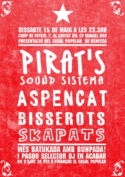 Aquest dissabte 15 de maig tindrà lloc la presentació oficial del Casal Popular de Benissa. L’acte es farà al camp de futbol 7 i comptarà amb l’actuació del reconegut grup de reggae barceloní Pirat’s Sound Sistema, junt als coneguts, i amb disc nou, Aspencat, els quals faran vibrar els assistents amb el seu mestissatge. Acompanyant la vetllada, i des de Jesús Pobre, no han volgut perdre’s aquesta festa els Bisserots i el seu rock potent. I per últim però no menys important tindrem la primera actuació oficial del grup de Benissa Skapats!, que ens presentaran les cançons que estan fent!
