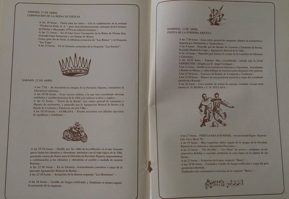 En aquest vídeo de les festes de 1978 podem veure diverses imatges interessants: un partit de futbol jugat al Camp de Futbol La Costa, acabat d’inagurar (29 de maig de 1976), entre festeres i festers per a arreplegar diners per a les festes. Hi ha imatges de les cervaviles des del carrer Alacant on es pot veure el molí de farina. Cal destacar també que el 1978 els moros i cristians es feien dins de les festes d’abril, el Dia del Riberer. Eixe dia es realitzaven les batalles per a reconquerir la plaça i en les cercaviles per a anar a la celebració de la missa es pot veure tant els clavaris i clavariesses, com als representants dels bàndols moro i cristià. L’entrada es realitzava eixe mateix dia per la vesprada, unint també la cercavila d’eixe dia amb la dels Moros i Cristians. Tot açò acabava al pàrquing de la plaça. El vídeo acaba amb el Dia del fadrins, bous i els cadafals de l’època amb bigues de fusta, camions, etc.