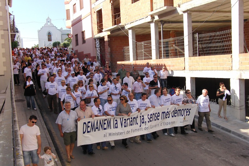 La manifestació va eixir des de la plaça del Portal i va seguir pel carrer València, carrer Pare Andrés, plaça Rei Jaume I, Carrer Fra Maseo Company i plaça del Rector Salvador Fuster. En aquesta última plaça, es va situar una pancarta amb un comptador diari del nombre de dies que transcorreran des de la manifestació fins l’inici efectiu de les obres, amb el compromís de realitzar concentracions en aquest mateix lloc si aquesta xifra arriba a cent. El lema de la pancarta va ser “DEMANEM LA VARIANT JA, SENSE MÉS DEMORES, al Ministeri de Foment del Govern d’Espanya”.