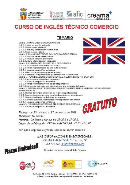 L’Agència de Desenvolupament Local Afic-Creama de Benissa ofereix un curs gratuït d’Anglés per a empresaris i treballadors del sector comerç que es farà del 13 de febrer al 27 de març, amb una durada de 50 hores. Les classes s’impartiran en l’agència de desenvolupament local, de dilluns a dijous de 15.00 a 17.00, i les places són limitades.