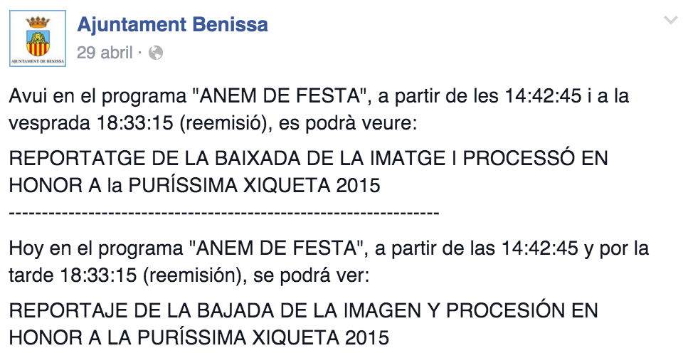 Televisión del Mediterráneo: 4525,4 euros es van gastar en la cadena propietat del Grupo Cope. Apareixen factures per la gravació, producció i emissió de diferents reportatges del programa “Anem de festa”. Així, es van gastar 290,4€ per la gravació durant la Fira i Porrat i es troben tres factures de 1411,67€ per la producció de 4 reportatges cadascuna d’elles. El compte de facebook de l’Ajuntament es va fer ressò durant les festes patronals de l’emissió del programa.