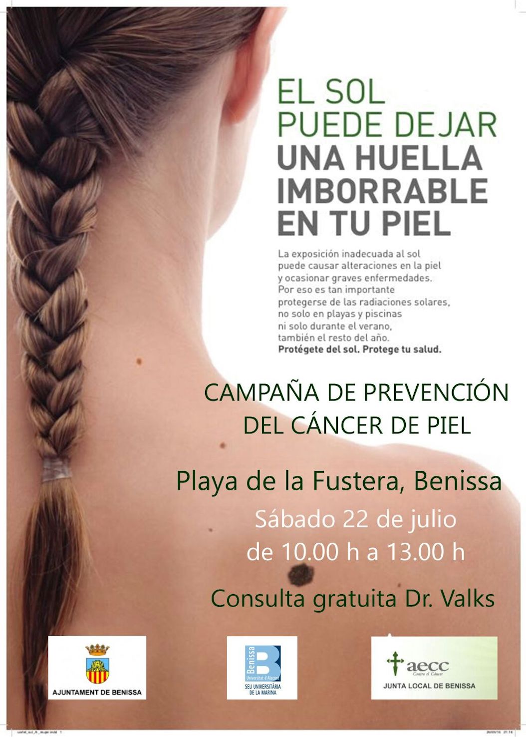 Aprofitant la temporada d’estiu i les altes temperatures, l’Ajuntament de Benissa, en col·laboració amb la Seu Universitària de la Marina i AECC Benissa, ha organitzat una campanya de prevenció de càncer de pell. El pròxim dissabte, 22 de juliol, veïns, veïnes, visitants i turistes podran acudir a la platja de la Fustera perquè el Dr. Valsk, especialitzat en dermatologia i expert en càncer de pell, els passe consulta de 10.00h a 13.00h de forma gratuïta.