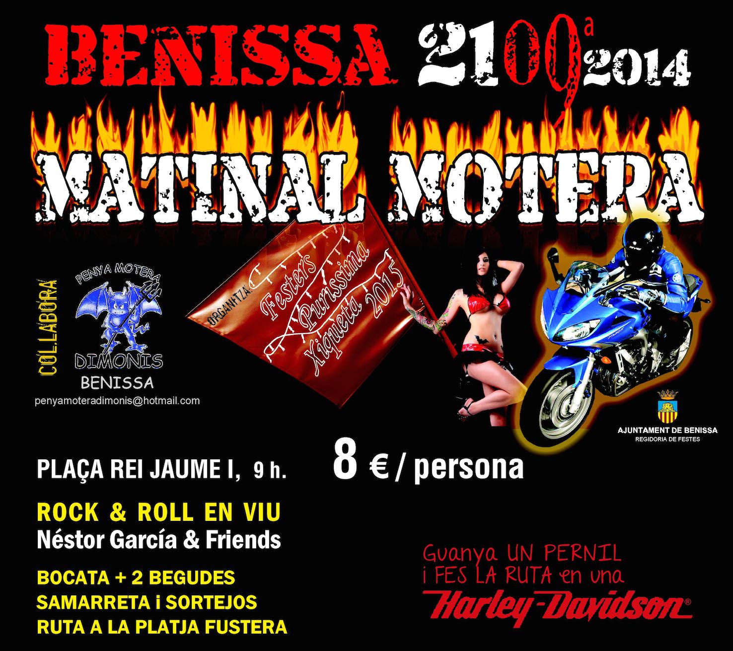 Els festers de la Puríssima Xiqueta 2015, juntament amb la Penya Motera Dimonis i amb el suport de la Regidoria de Festes de l’Ajuntament de Benissa, han preparat per al diumenge 21 de setembre la IX Matinal Motera, que des de les 9 del matí tindrà lloc a la plaça Rei Jaume I.