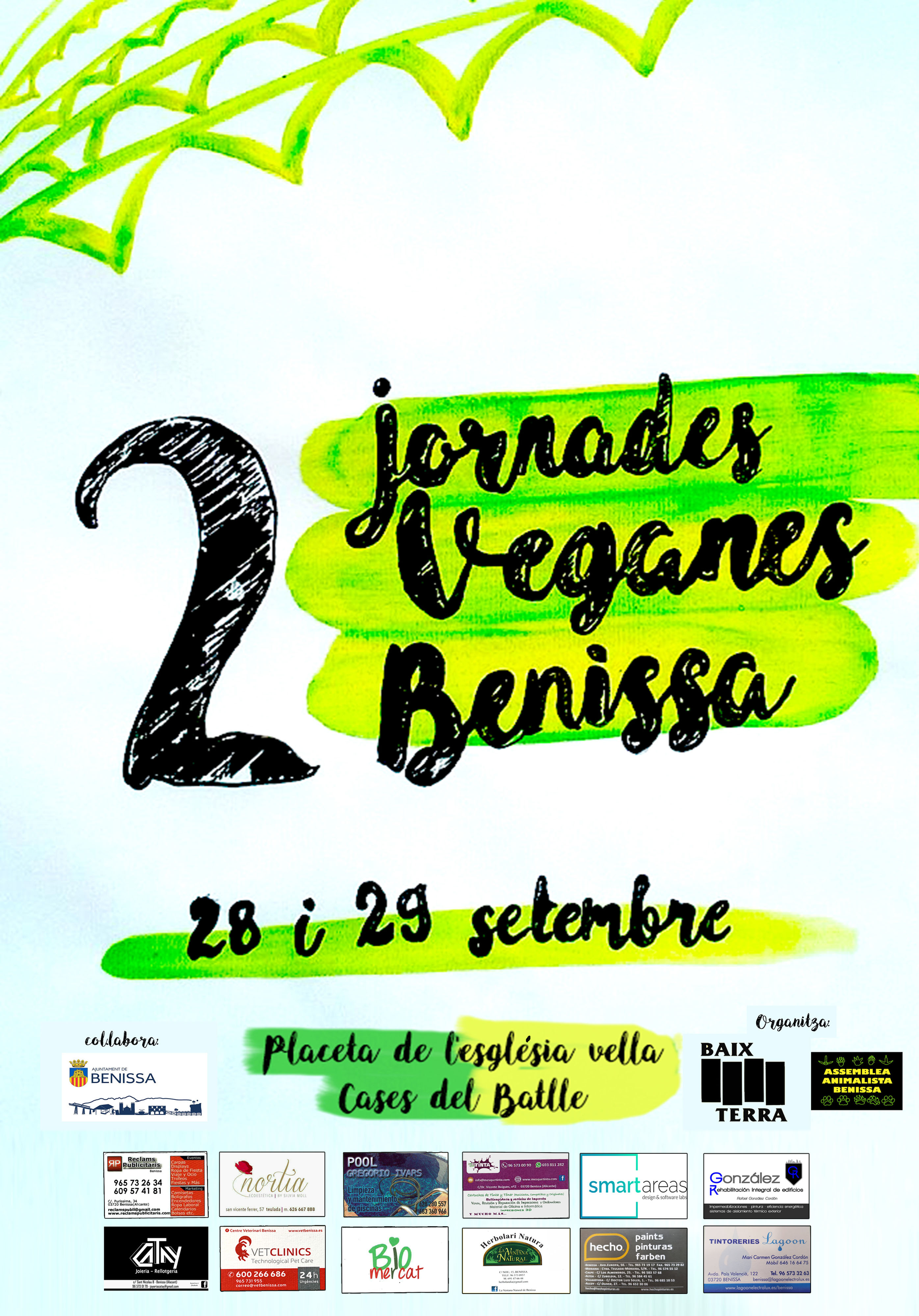 L’Assemblea Animalista de Benissa i el Col·lectiu Baix Terra organitzen aquest divendres 28 de setembre i dissabte 29 de setembre les Segones Jornades Veganes de Benissa. Les jornades comptaran amb un programa de xerrades variat i hi haurà una fireta amb productes vegans. El programa complet el podeu trobar a continuació: